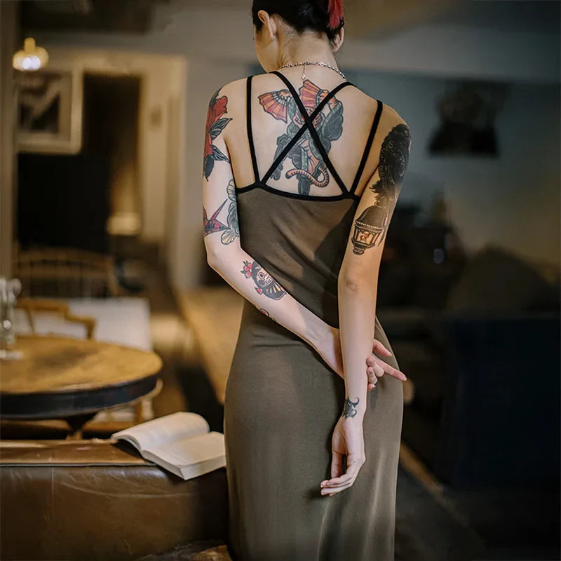 This dress, specially designed for the spring and summer season, combines elegance with comfort thanks to its lightweight and stretchy fabric. The A-line cut gently hugs the body, while the cross strap detail and sleeveless design provide a feminine look. An ideal choice for those looking to add elegance to their daily style.
