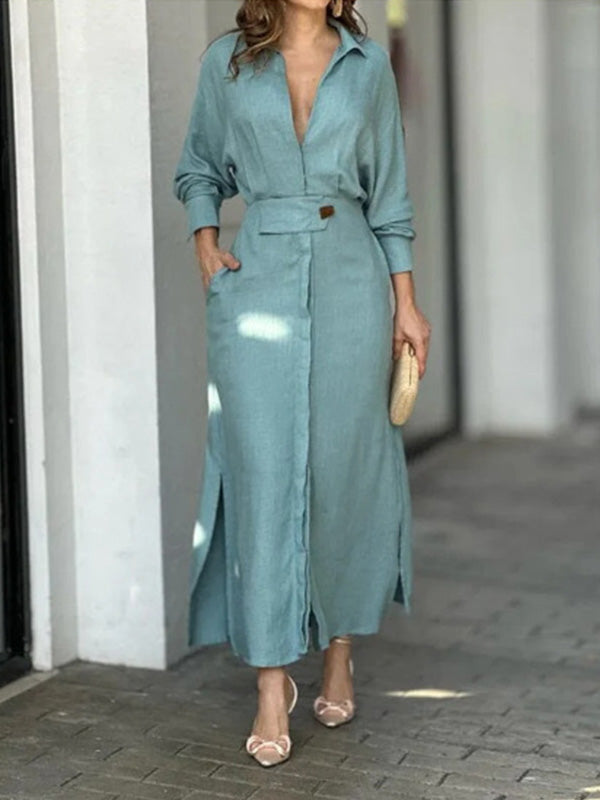 The VAAGOON Chic Dress combines elegance and comfort, symbolizing urban style with its maxi length and elegant shirt collar detail. Made from 100% polyester fabric, its long-sleeved design and side slit detail allow you to move freely throughout the day. This dress can be preferred for both daily wear and evening elegance, adding a strong touch to your style.