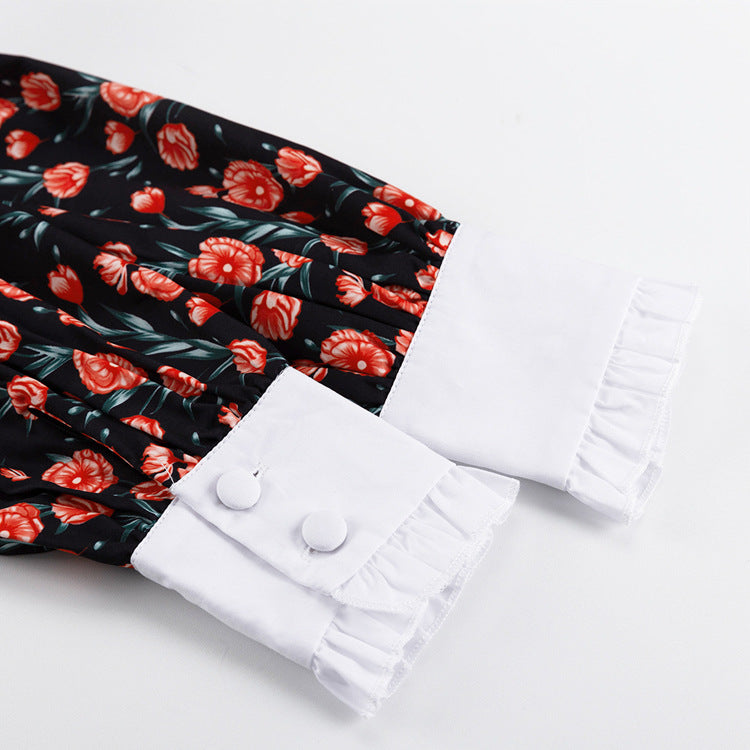 • Detail: Ruffled collar, balloon sleeve, floral pattern
