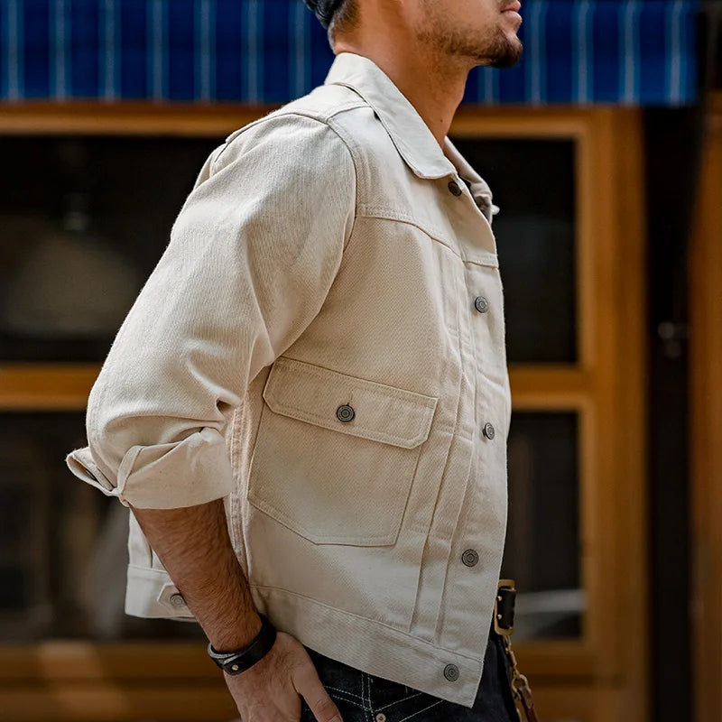 This premium denim jacket crafted from 440 g/m² heavyweight cotton delivers durability with authentic vintage character. Inspired by the iconic Type II workwear style, it features a slim fit, structured silhouette, front button closure, and double-pleated chest design. Designed for everyday use in spring and autumn, it blends rugged heritage with timeless style.