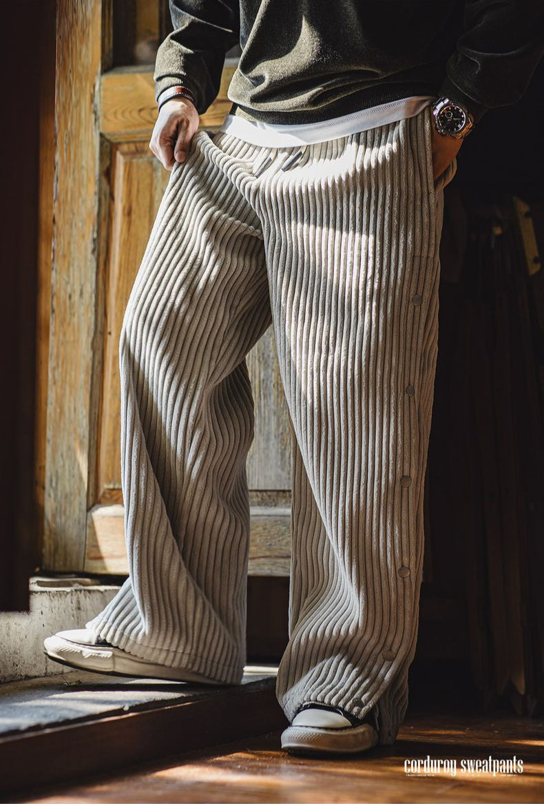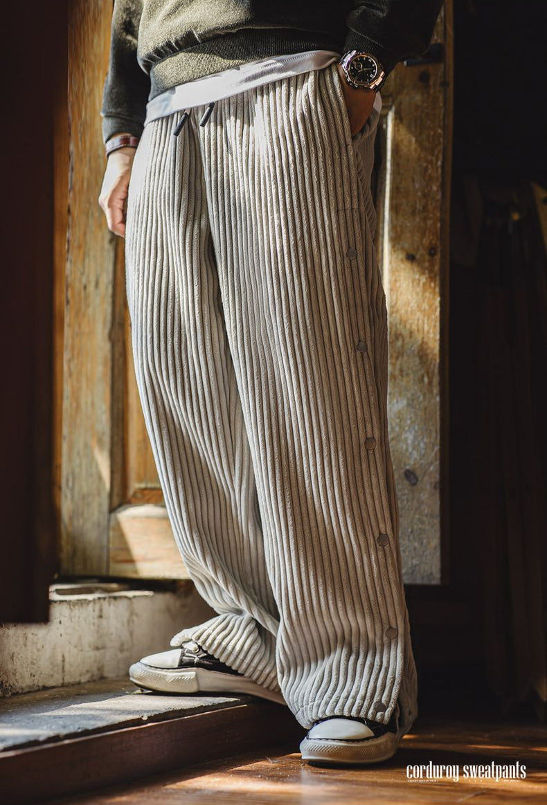 The Vaagoon Corduroy Sweat Pants blend American casual style with modern details, offering a comfortable, loose fit. With a mid-rise waist and lace-up closure, they deliver all-day comfort. Their autumn-appropriate thickness, clean color, and polyester-blend fabric appeal to those seeking both elegance and ease.