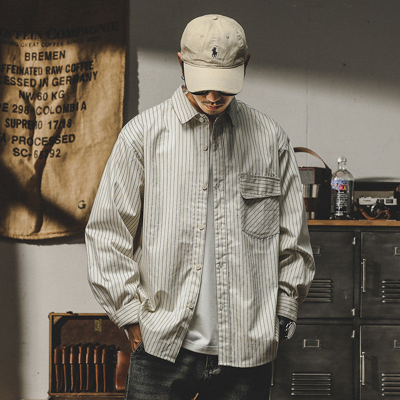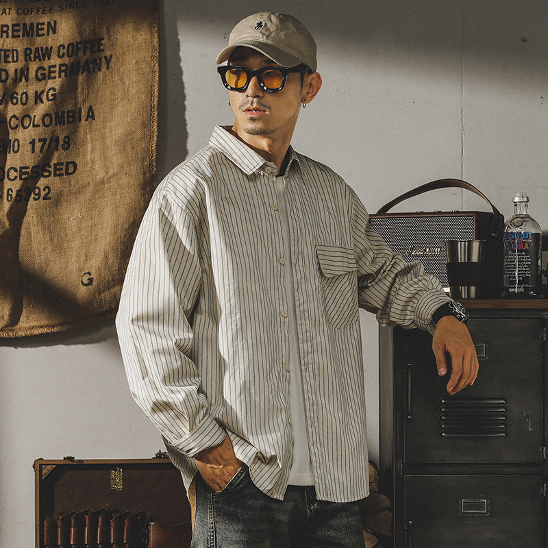 The VAAGOON Desert Mirage shirt combines the striped pattern with an American retro vibe in beige tones, crafted from cotton jersey fabric. Its long-sleeved relaxed fit provides both elegance and comfort on autumn days.