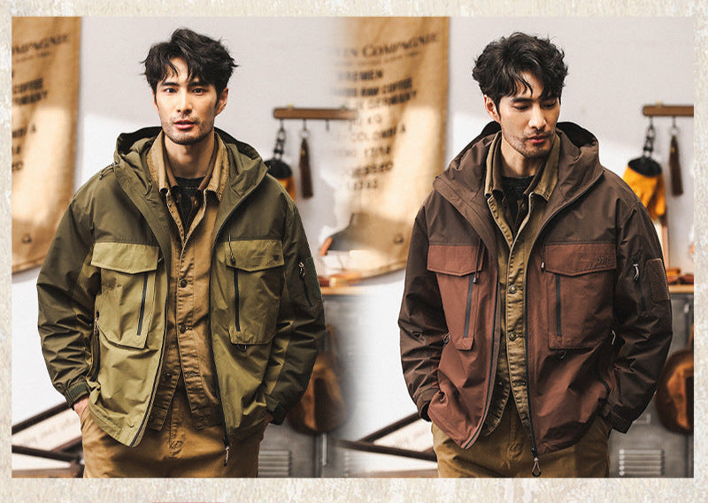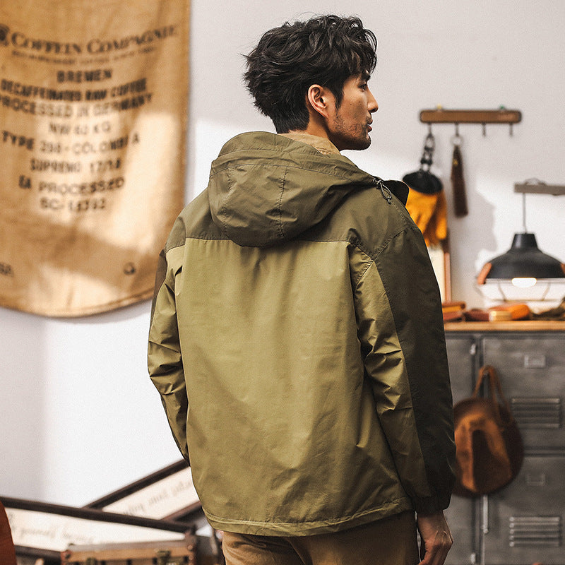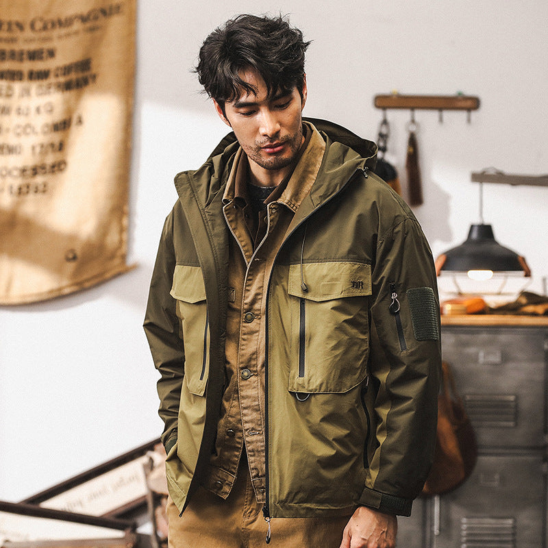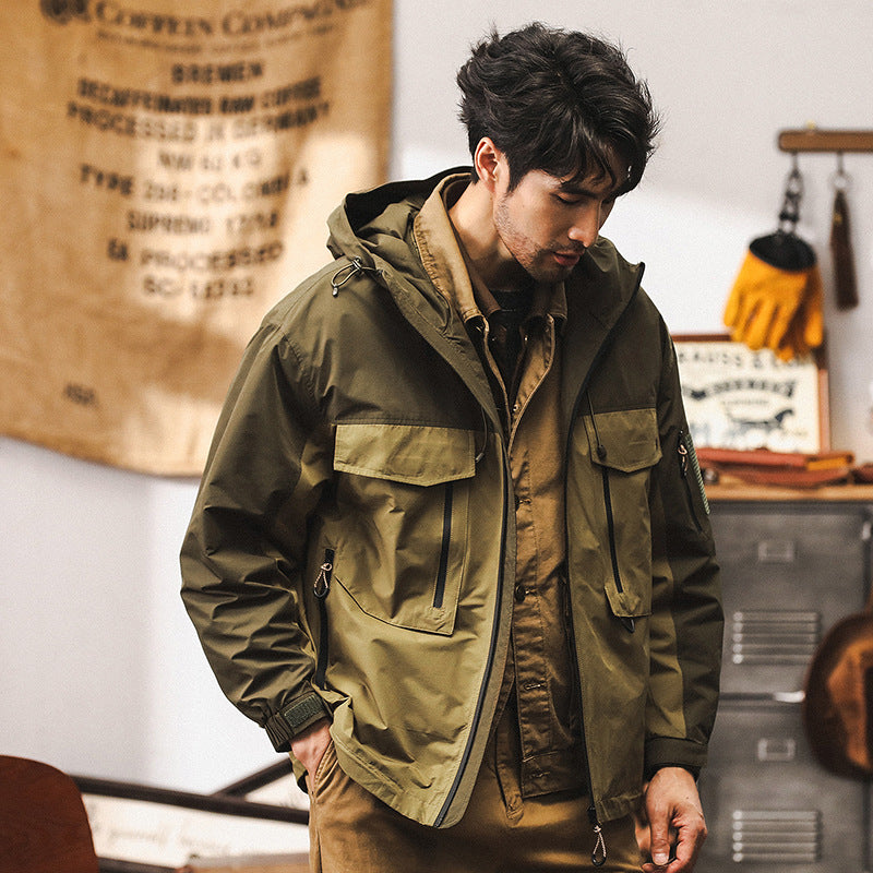 This seasonal jacket, designed in accordance with a youthful style understanding, offers both comfort and functionality with its breathable fabric and elastic hem. Its hooded structure, multiple pockets, and brown-green tones provide a dynamic exterior look. It is ideal for the autumn season and suitable for outdoor activities.