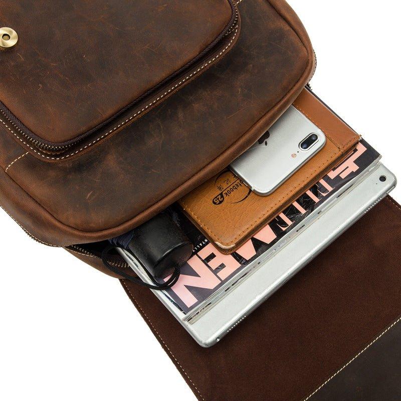 Genuine Leather College Backpack is highly practical with its large capacity for laptops, books, magazines, thermos cups, umbrellas, and other daily needs. Its flap-style closure instead of a zipper helps protect your belongings from theft.