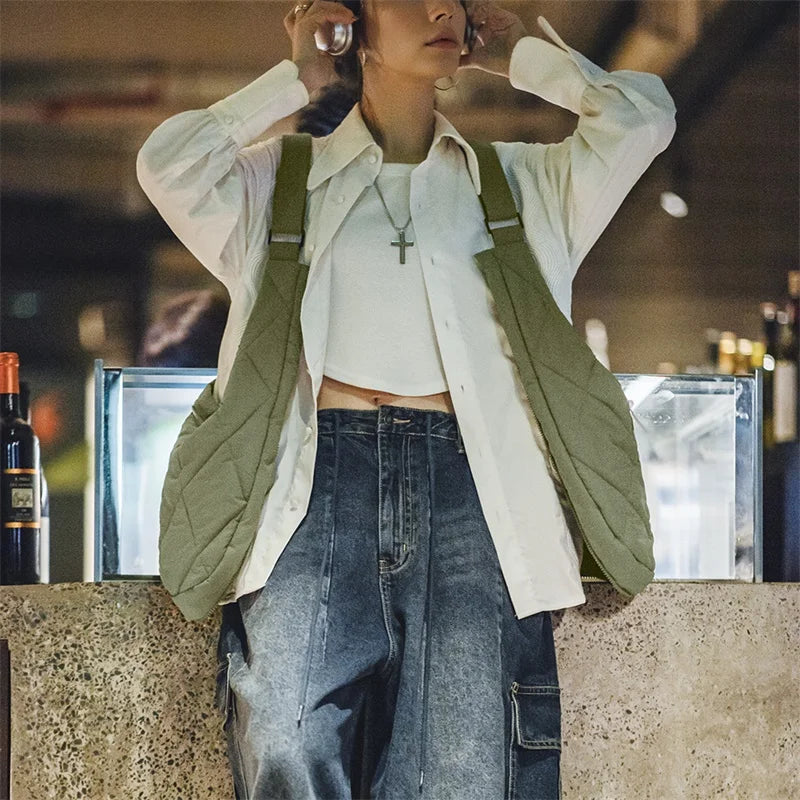 This lightweight vest, designed for all seasons, combines simple elegance with functionality. Its pocketed design and zip closure add practicality to your daily outfits. With its short cut, it can be easily paired with shirts and blouses. Its most striking feature is its ability to easily transform into a stylish bag when needed.