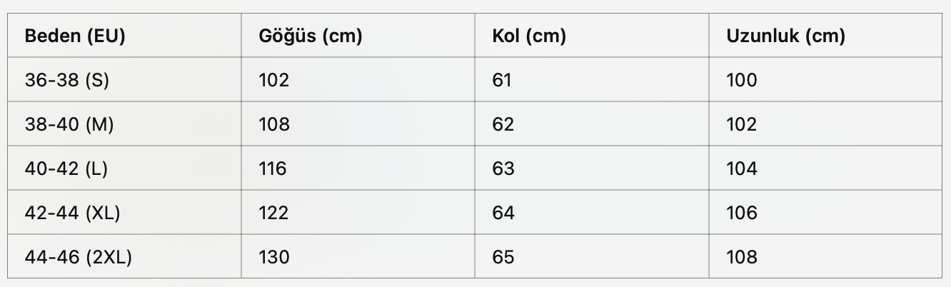 Size (EU) Chest (cm) Sleeve (cm) Length (cm)