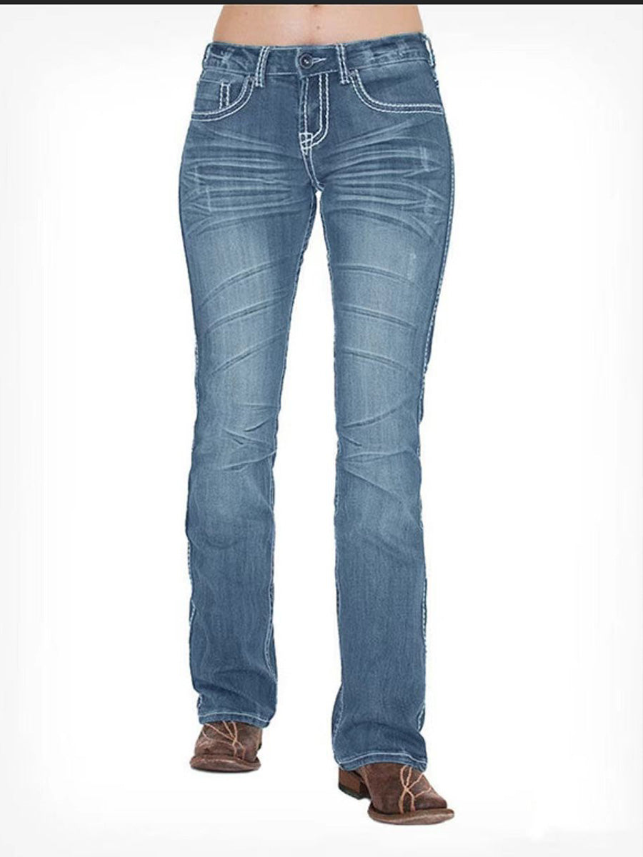 This pair of pants combines the cowboy spirit with modern lines, offering both comfort and style with its distressed texture and aesthetic stitching details. Its mid-rise structure and relaxed fit allow you to move freely throughout the day. The white embroidery on the back pockets and special stitching on the sides give the product a unique flair.