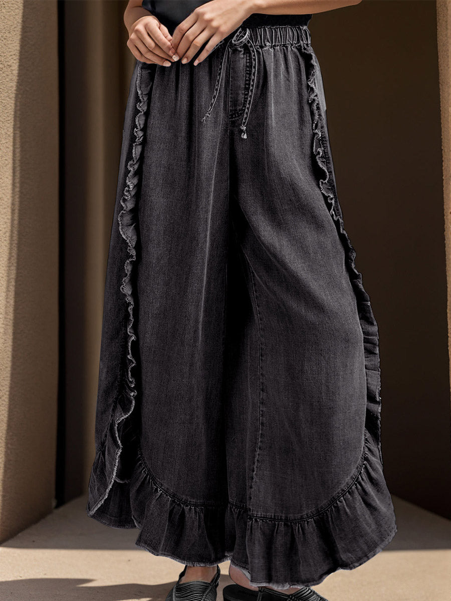 These pants are designed with a comfortable silhouette and offer a perfect style for daily use. The adjustable lace detail provides a personalized fit, while the slight ruffle texture at the waist adds a feminine touch. The soft and durable denim fabric with a wide-leg design offers both breathability and freedom of movement. They can be easily used in casual or chic combinations.