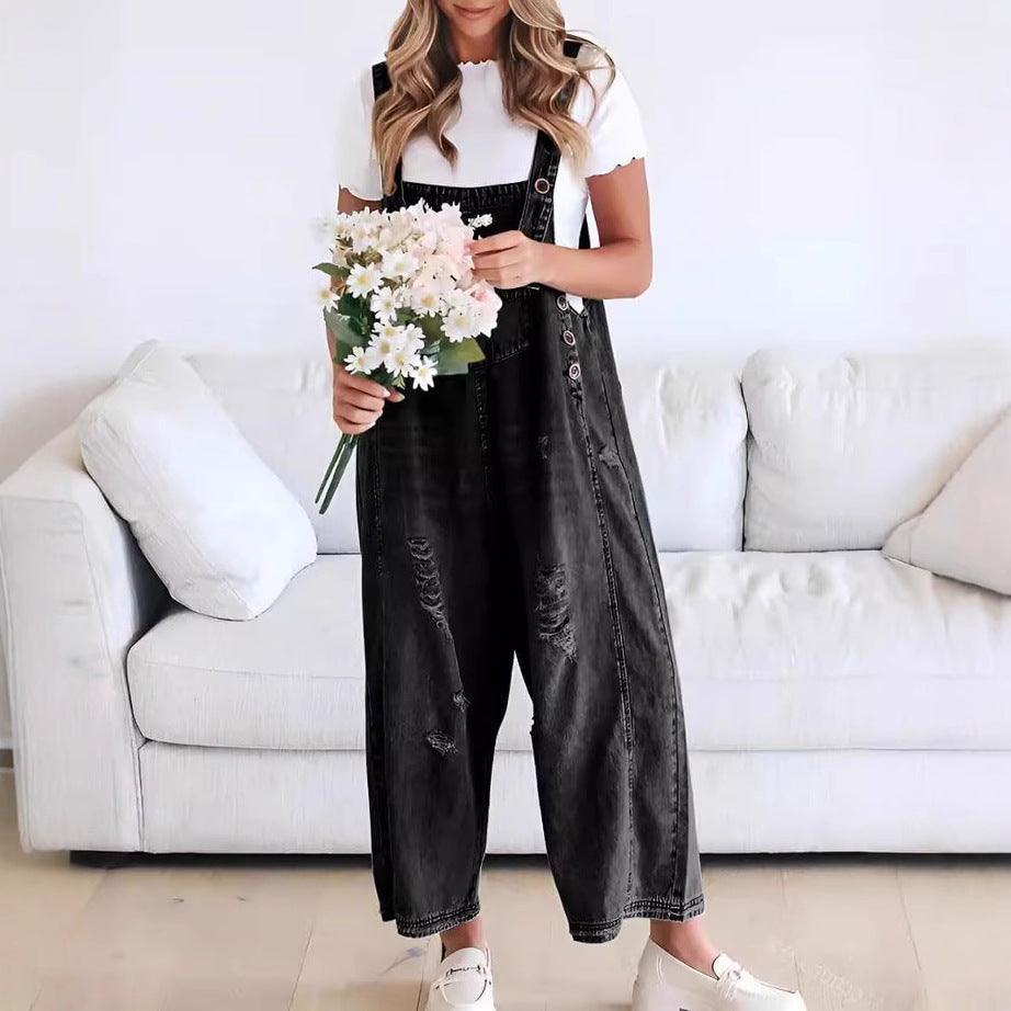 This denim jumpsuit combines elegance and a free style, offering a unique look with its washed faded finish and distressed details. Thanks to its adjustable straps, it provides a personalized fit, while the loose and wide leg cut offers maximum comfort. An essential piece for both street style and casual combinations!