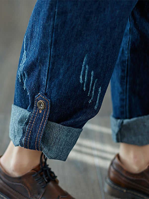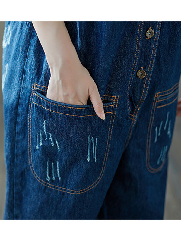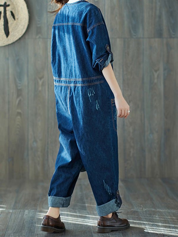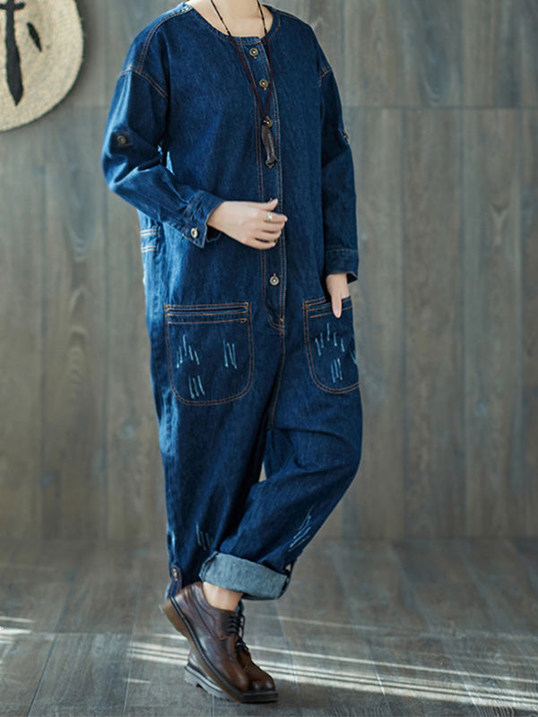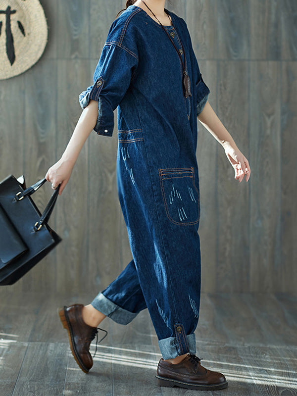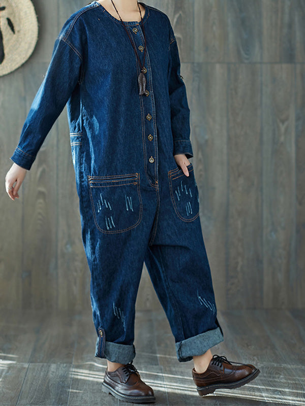 This jumpsuit, where comfort meets elegance, stands out with its loose fit and functional details. The dark wash effect adds a modern touch, while the two large pockets at the front offer both style and functionality. With adjustable buttons providing personalized comfort, this model ensures you look stylish in every setting from city life to nature.